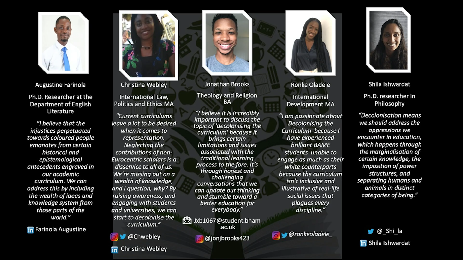 We have added a video to your teaching resources page. Dr Pat Noxolo’s talk on on (Post)COVID-19 Online Learning Opportunities & Dangers for Black Students & Staff was presented as part of the Decolonising the Curriculum symposium, led by University of Birmingham students (see image below). You can watch other contributions here.